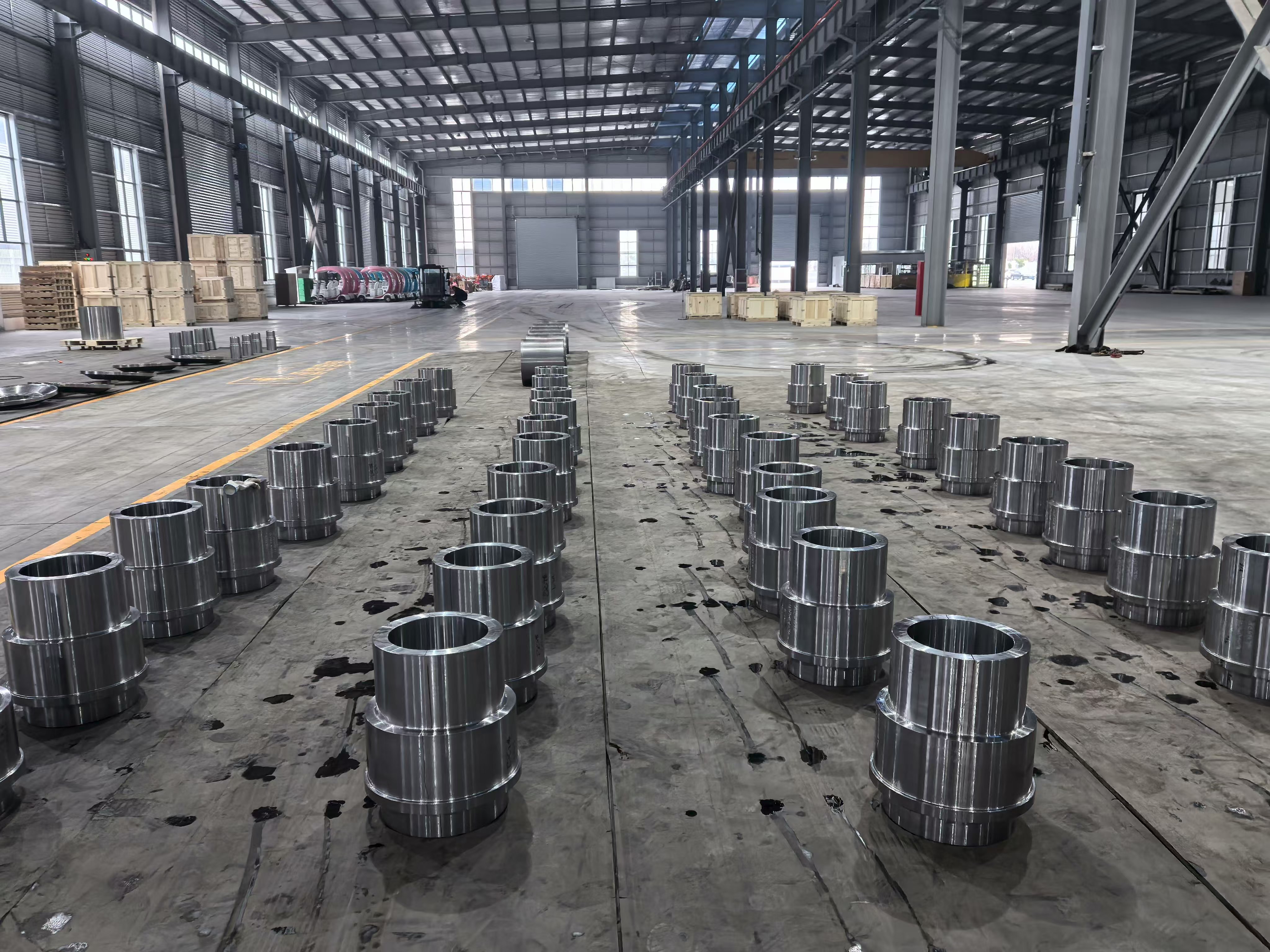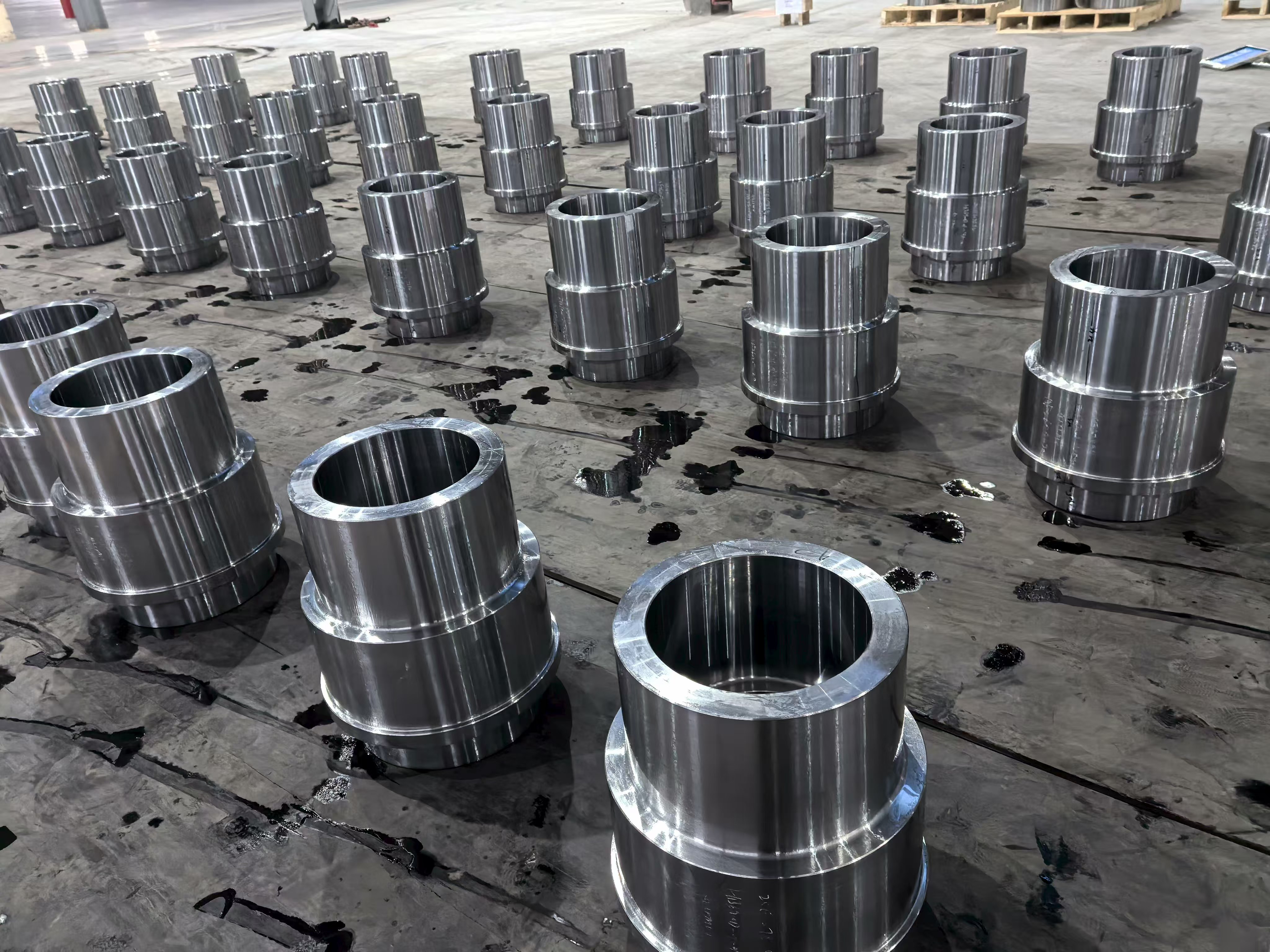 Inspeksjonssystemet inkluderer dimensjonsmåling, overflatemåling, ikke-destruktiv testing (NDT) utstyr og kvalifisert testpersonell. Intern kvalitetskontroll strekker seg fra verifisering av materialmikrostruktur - hardhetstesting og metallografisk undersøkelse etter varmebehandling - til ekstern dimensjonsoverholdelse og bekreftelse av overflateutseende før forsendelse. Denne strengheten er direkte synlig i produksjonsanleggets bilder, der ferdigbearbeidede komponenter viser den nøyaktige overflatefinishen og konsistente geometrien som er resultatet av disiplinert prosesskontroll gjennom hele produksjonssekvensen.