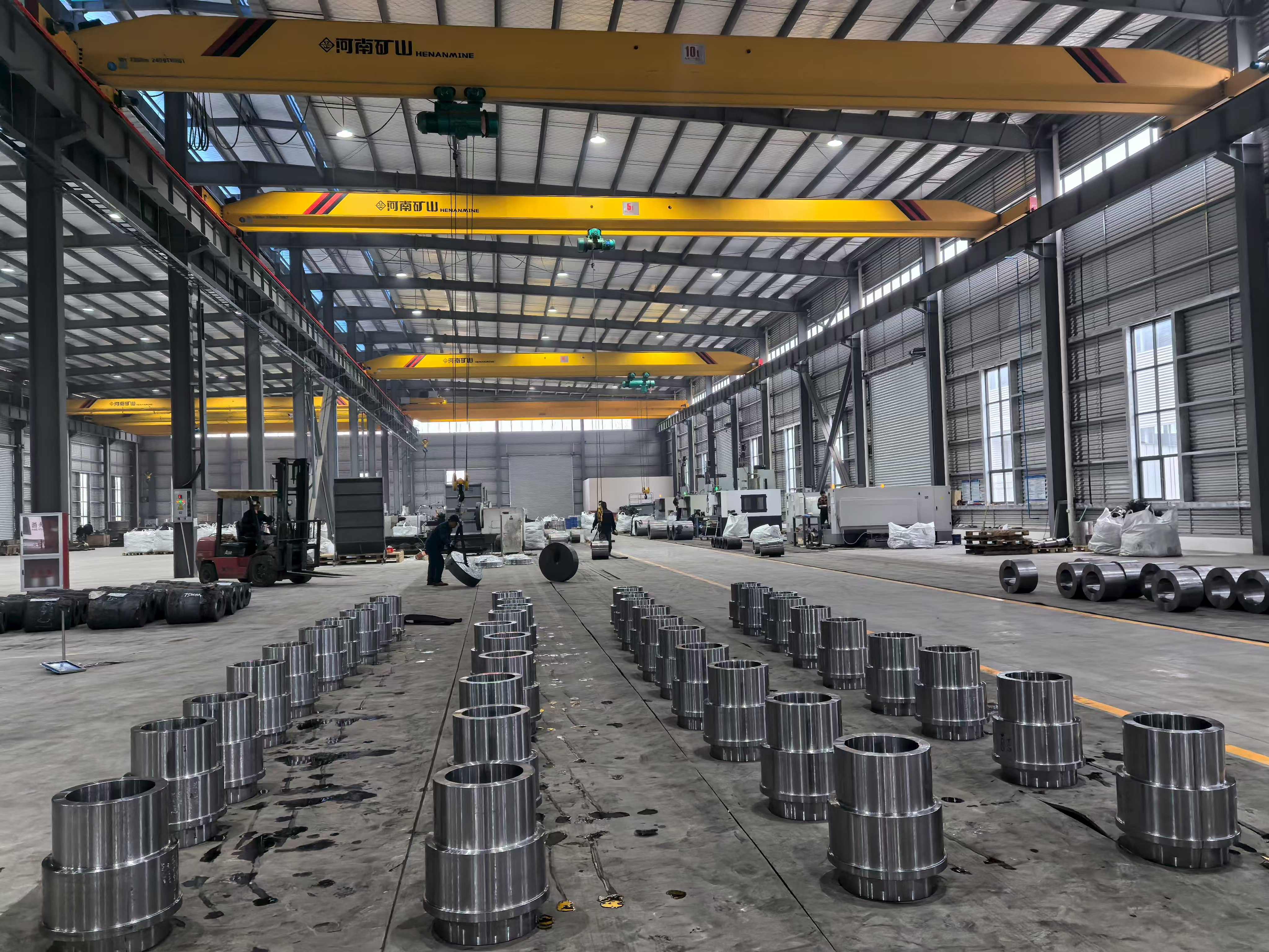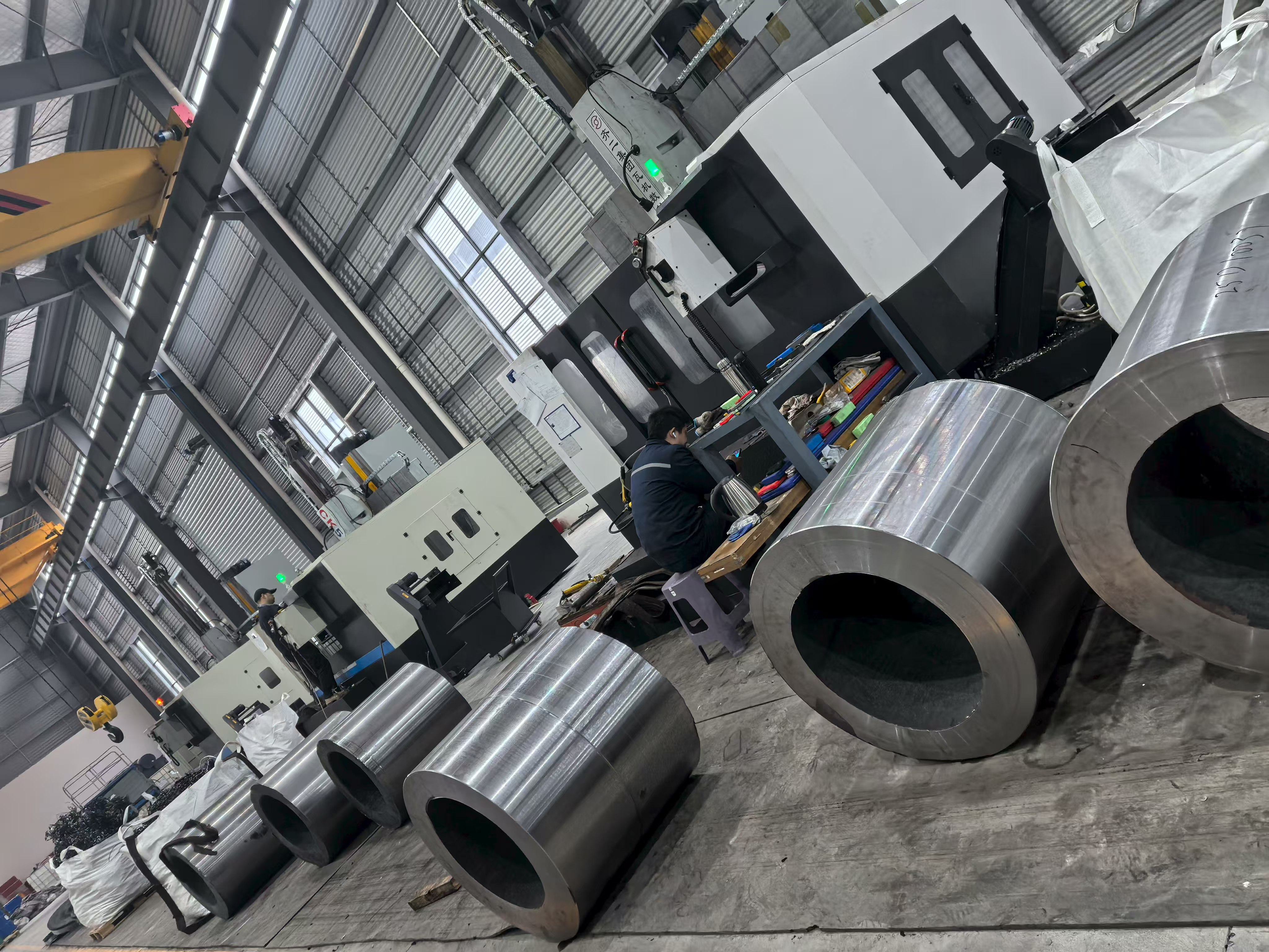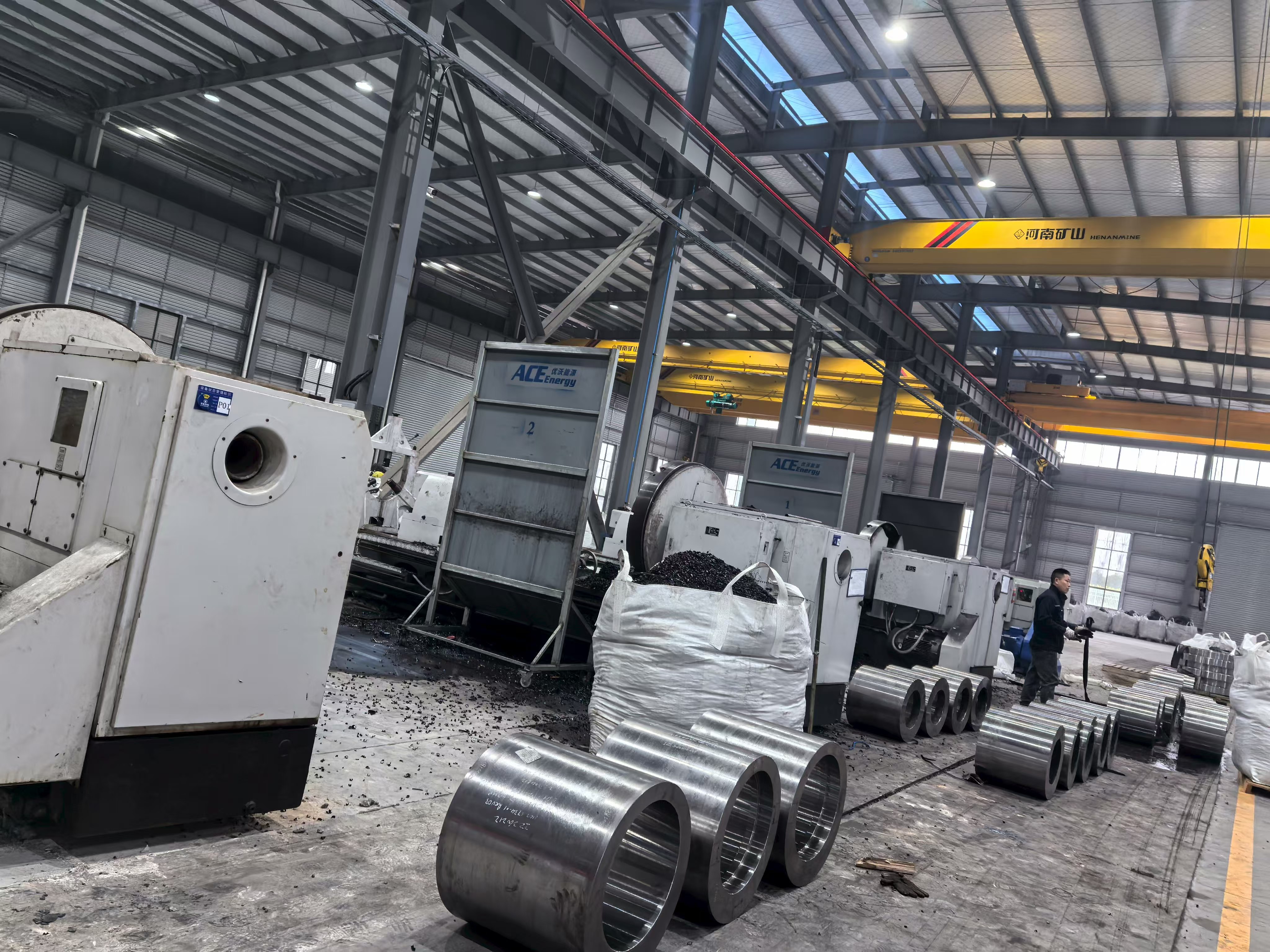 Konsernets primære og største anlegg, denne produksjonsbasen, er der hoveddelen av ACE Groups smiing, varmebehandling og presisjonsmaskinering genereres. Anleggsfotografering viser omfanget av denne operasjonen tydelig: Ekspansive stålkonstruksjonsverksteder med høy bukt utstyrt med flere overliggende brokraner, storformat CNC maskineringssentre som behandler tunge sylindriske komponenter, og pent arrangerte partier med ferdige presisjonsmaskinerte deler klare for inspeksjon og sending. Verkstedets gulvlayout gjenspeiler organisert flytstyring - råmaterialer og materialer som er i prosess er atskilt fra ferdige komponenter, og produksjonssoner er avgrenset av gulvmerker i samsvar med prinsipper for lean manufacturing.